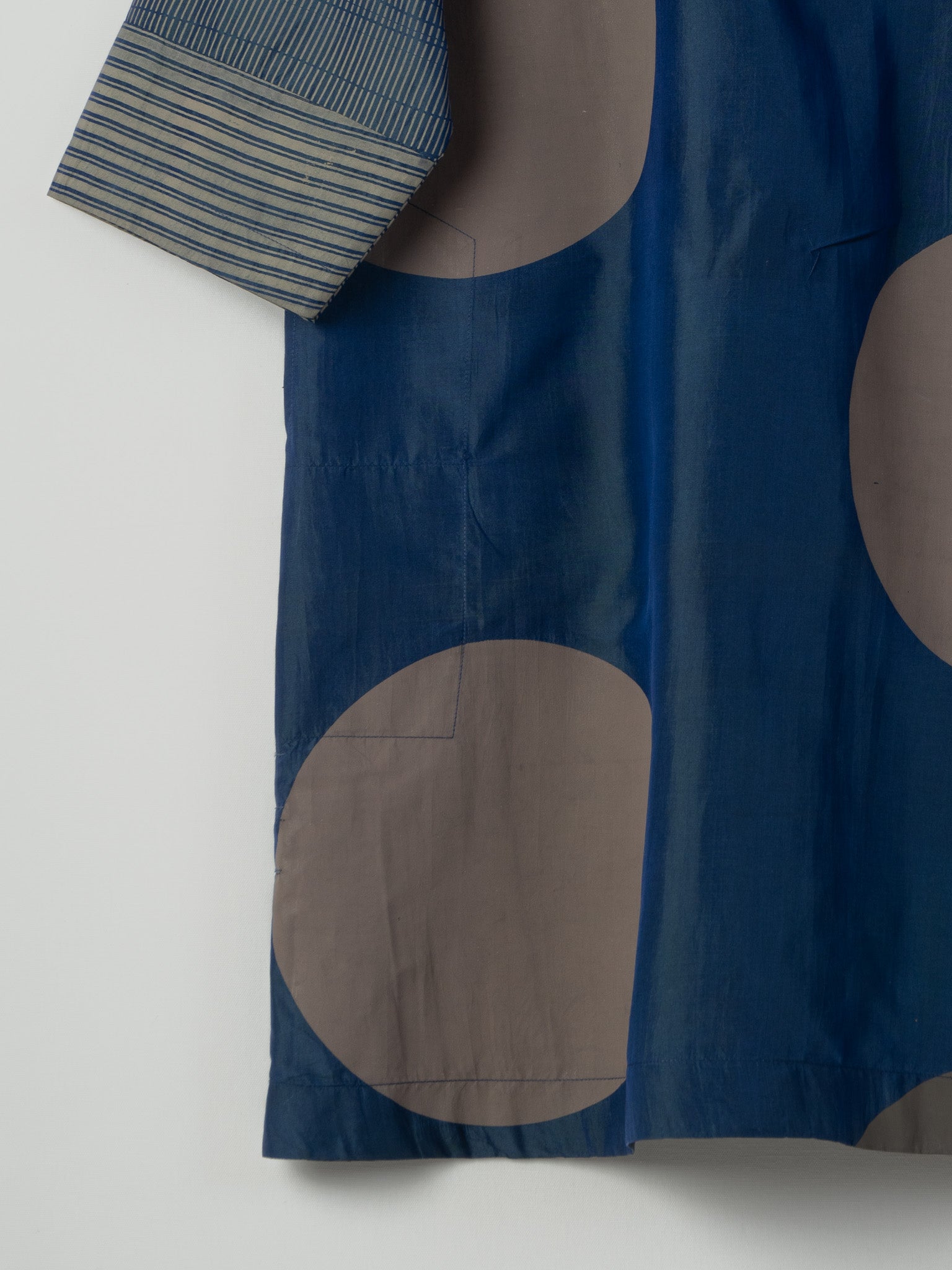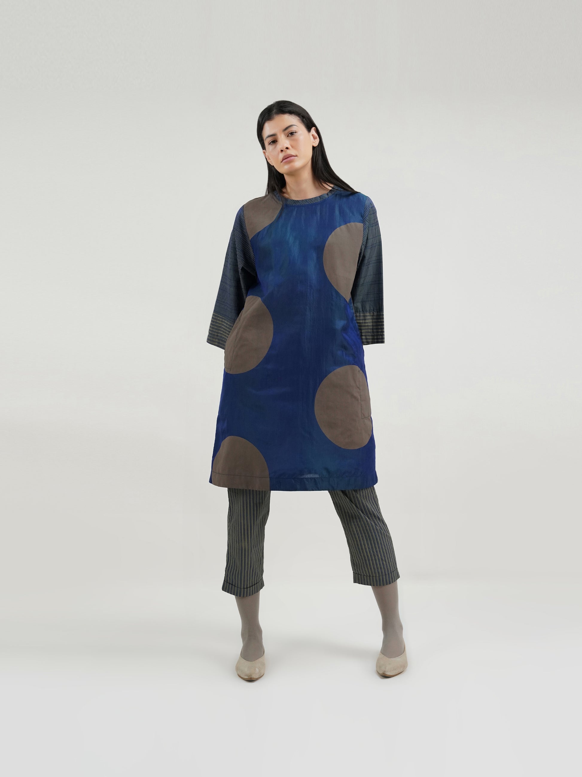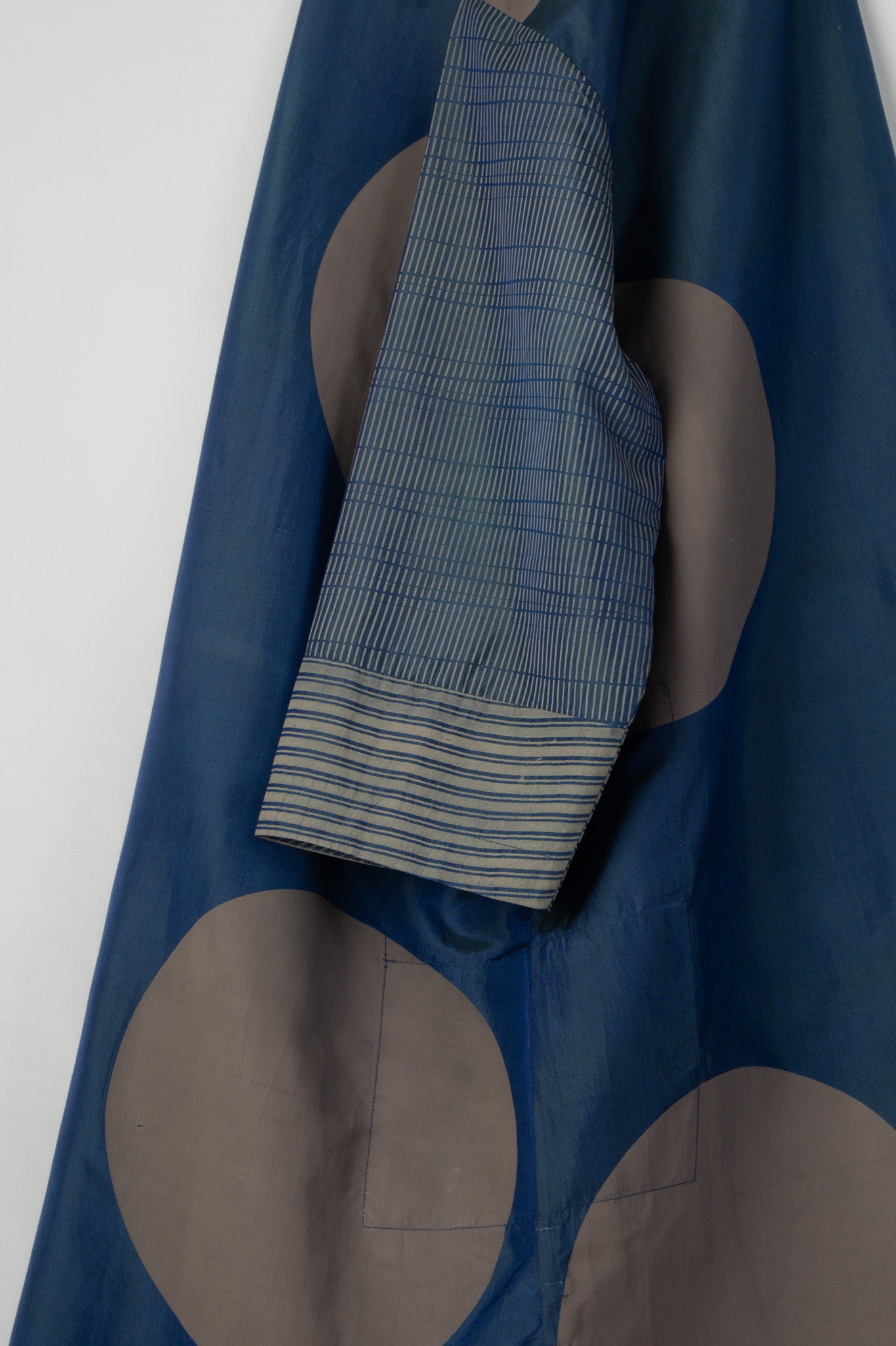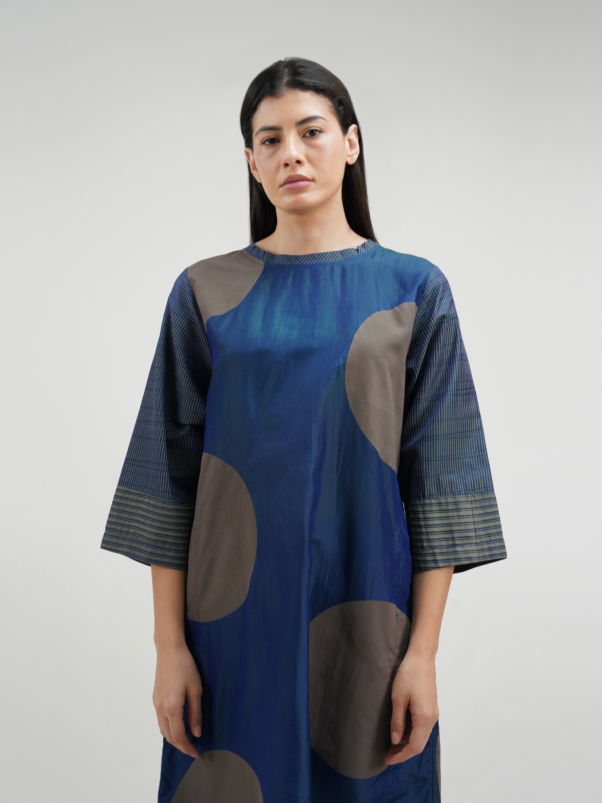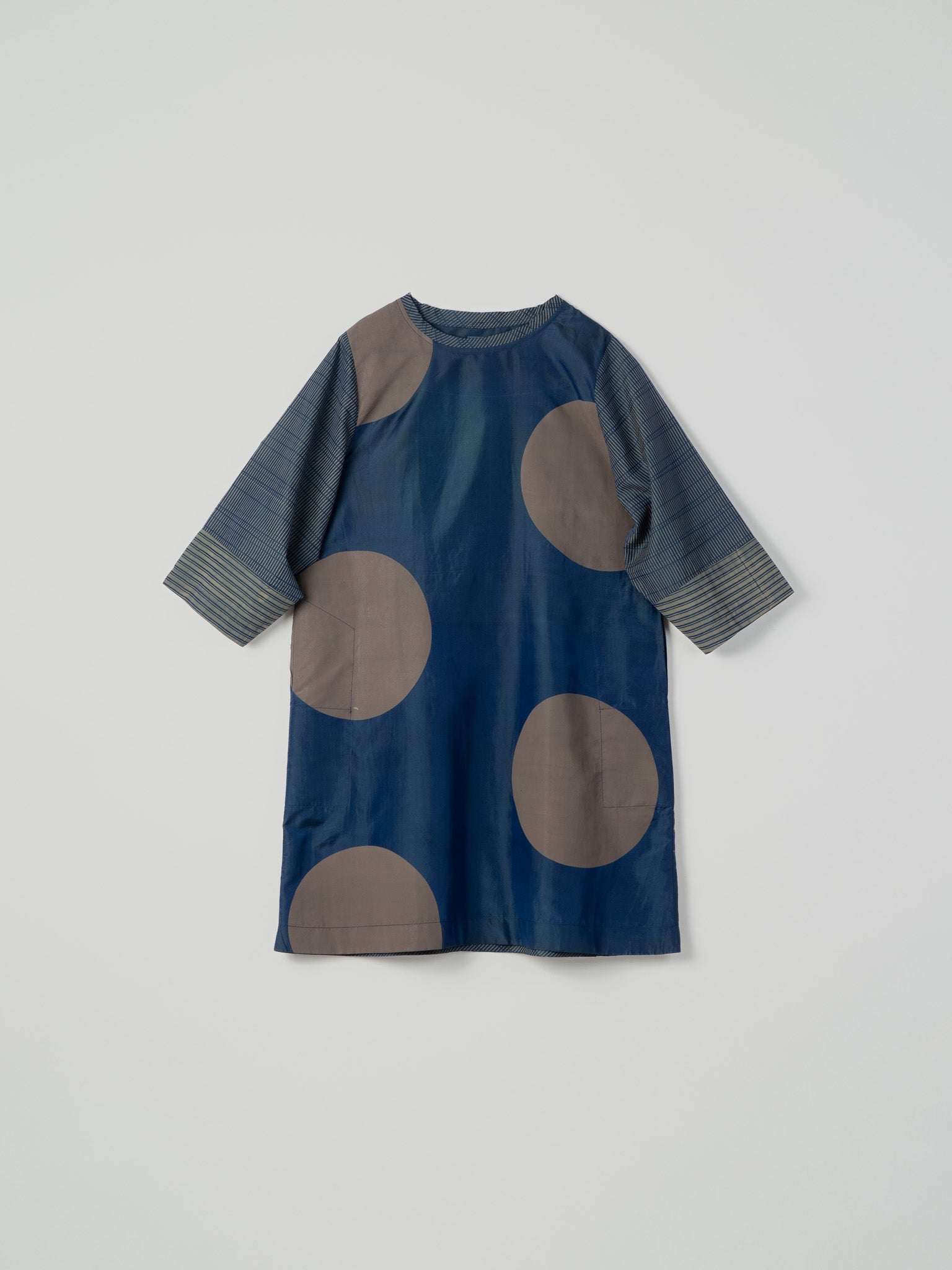 -THIS SLIGHTLY A-LINE DRESS WITH 3/4 SLEEVES IS MADE WITH LIGHT TIGHTLY WOVEN SILK WITH THREE DIFFERENT KINDS OF PRINTS.