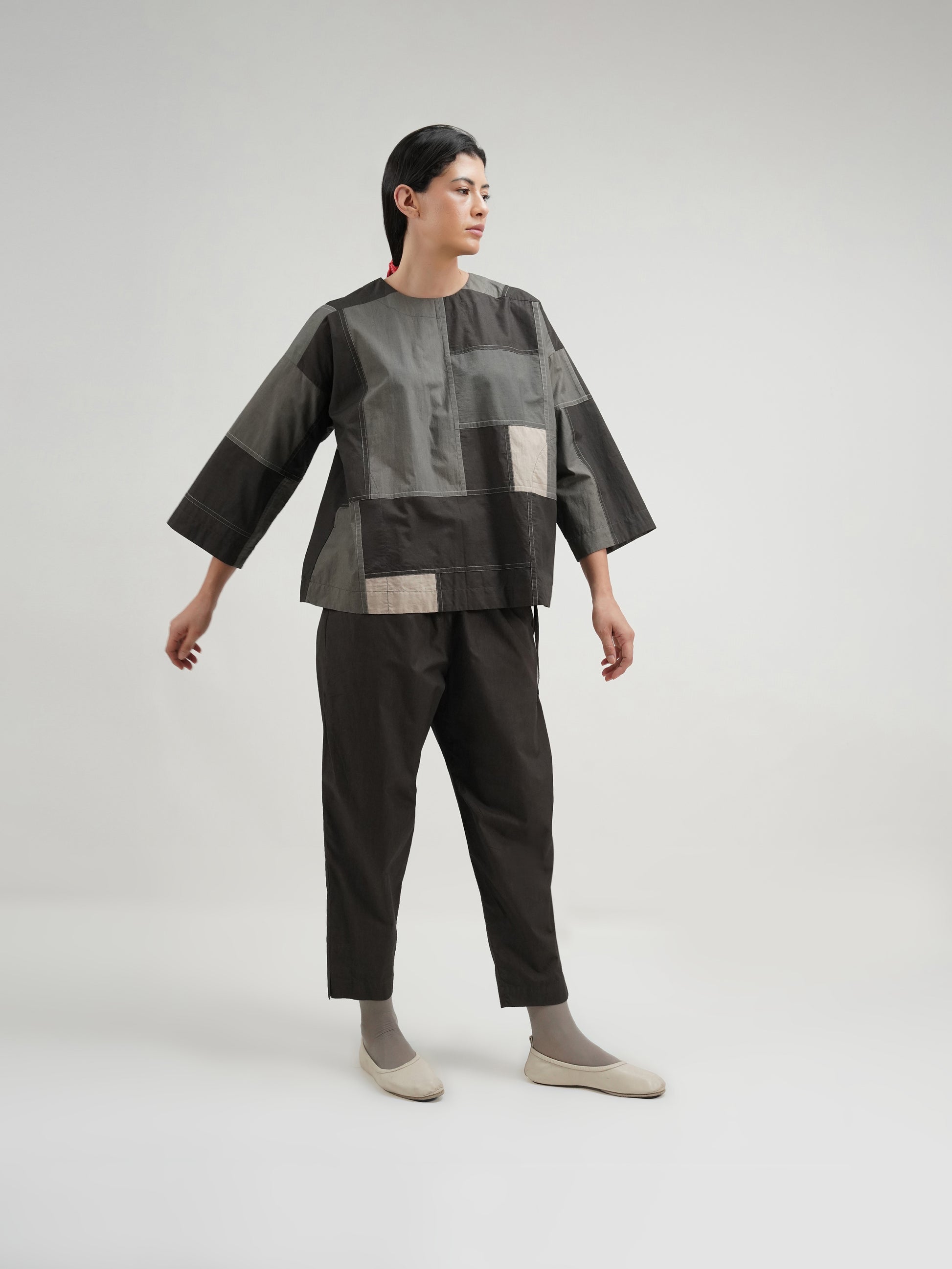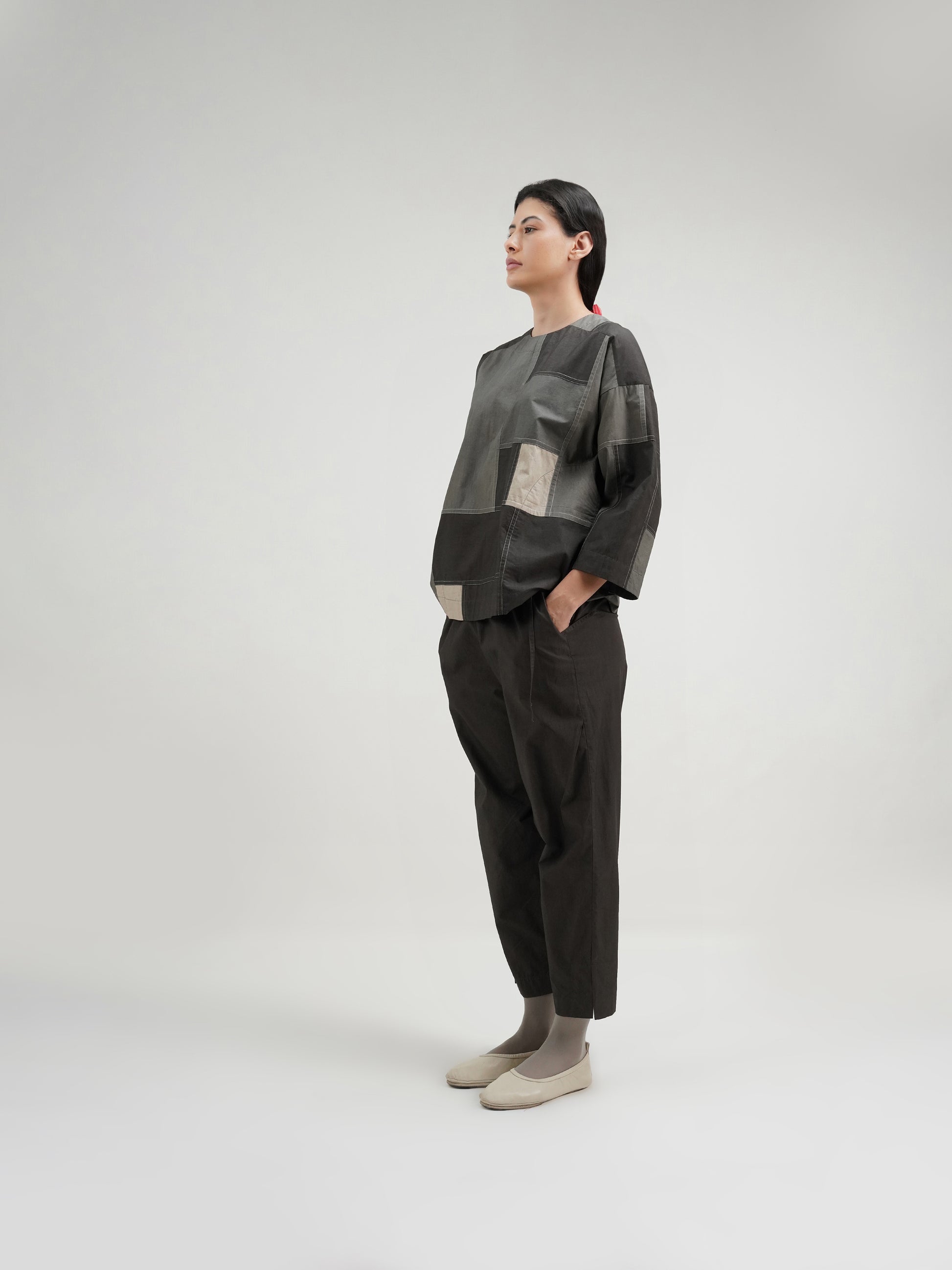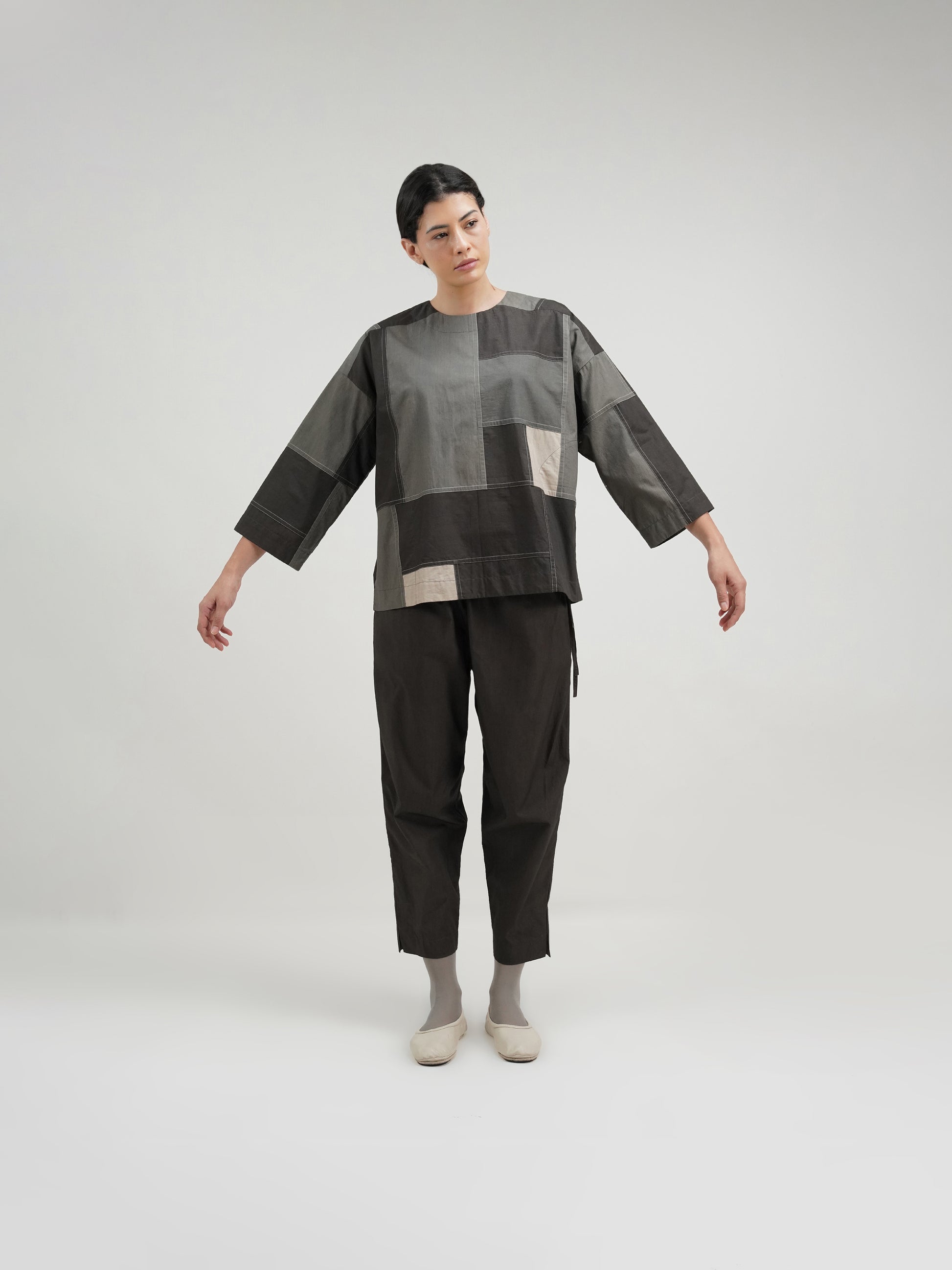 THE SEASONS. IT CAN BE COMBINED WITH THE GREY TUCK PANT MADE FROM THE SAME FABRIC AS THE TOP.