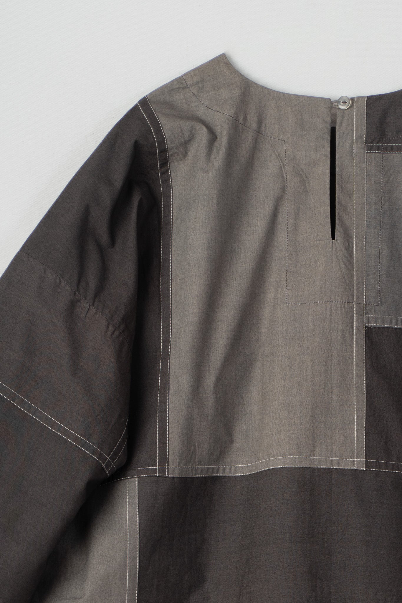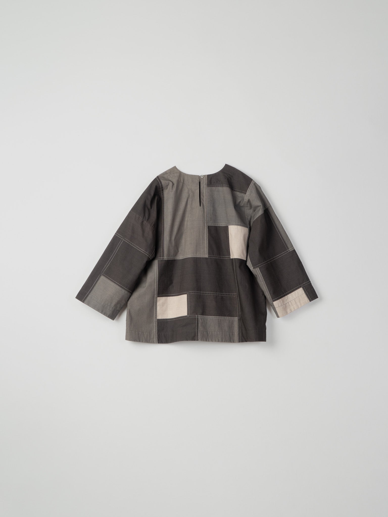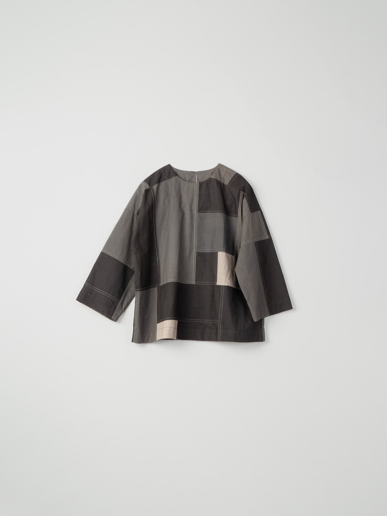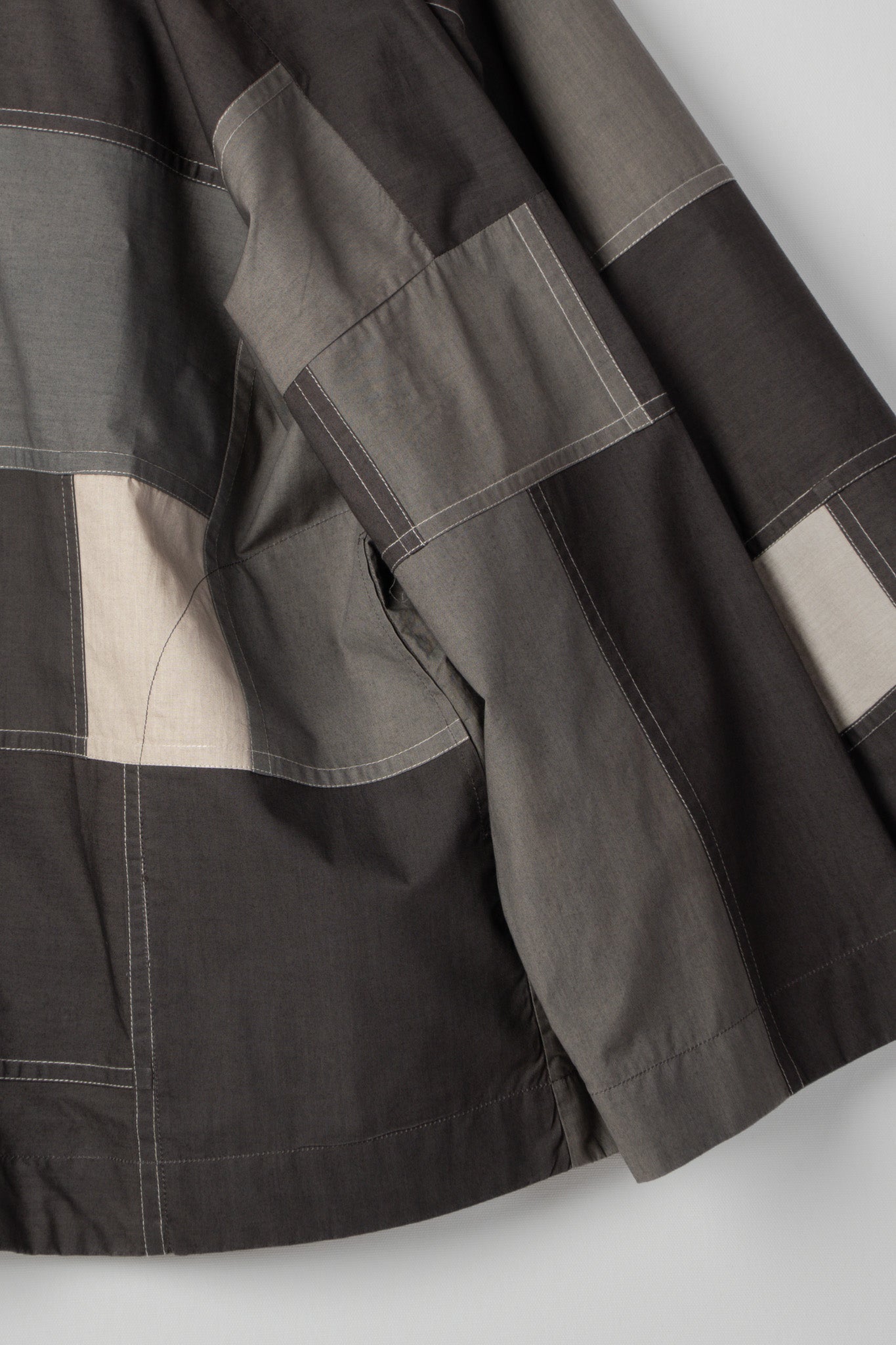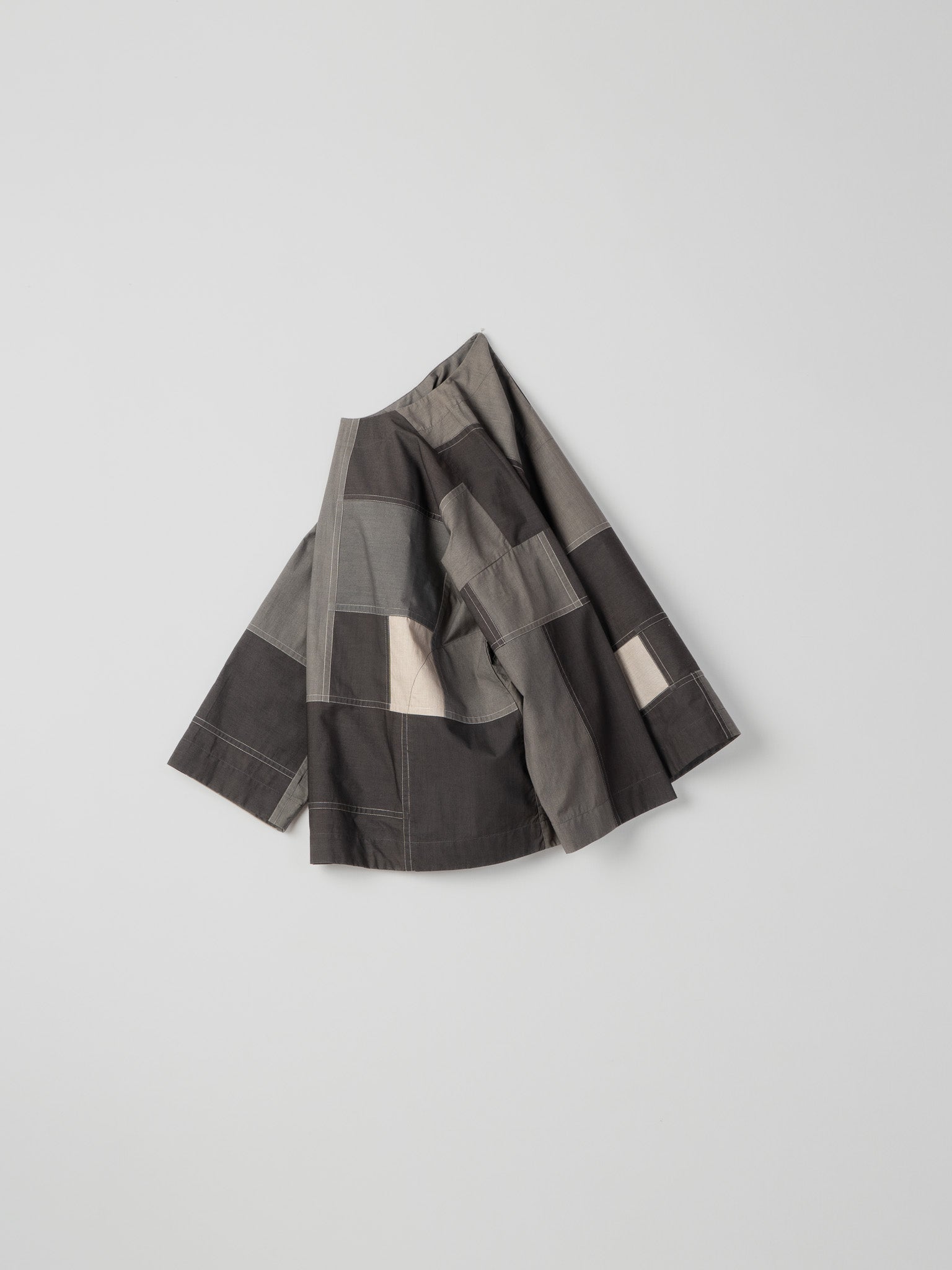 SLEEVES IN A PLAYFUL PATCHWORK INSPIRED BY JAPANESE TECHNIQUE OF REPAIRING TEXTILES.
