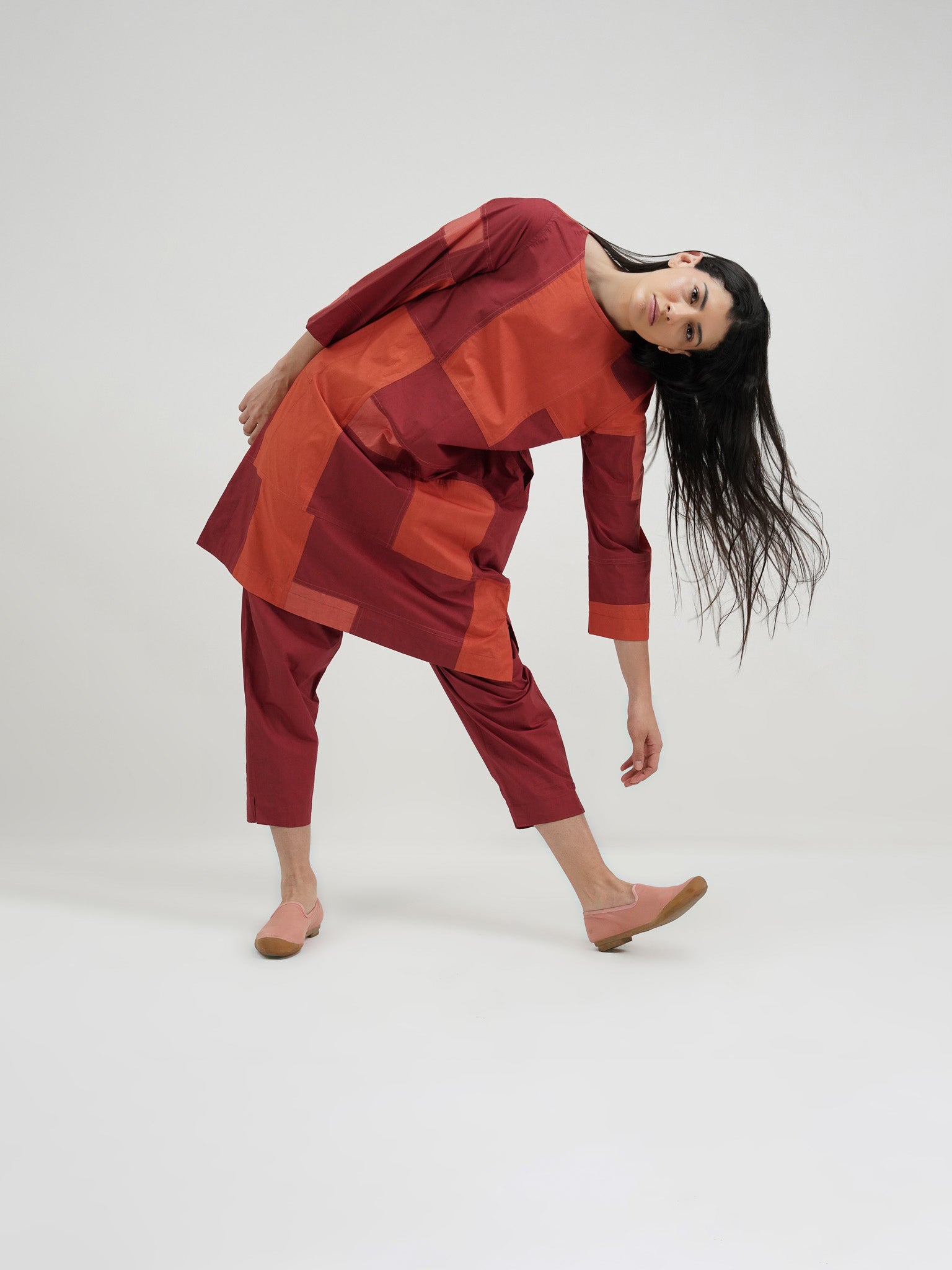 -IT CAN BE COMBINED WITH THE RED TUCK PANT MADE FROM THE SAME FABRIC AS THE DRESS.