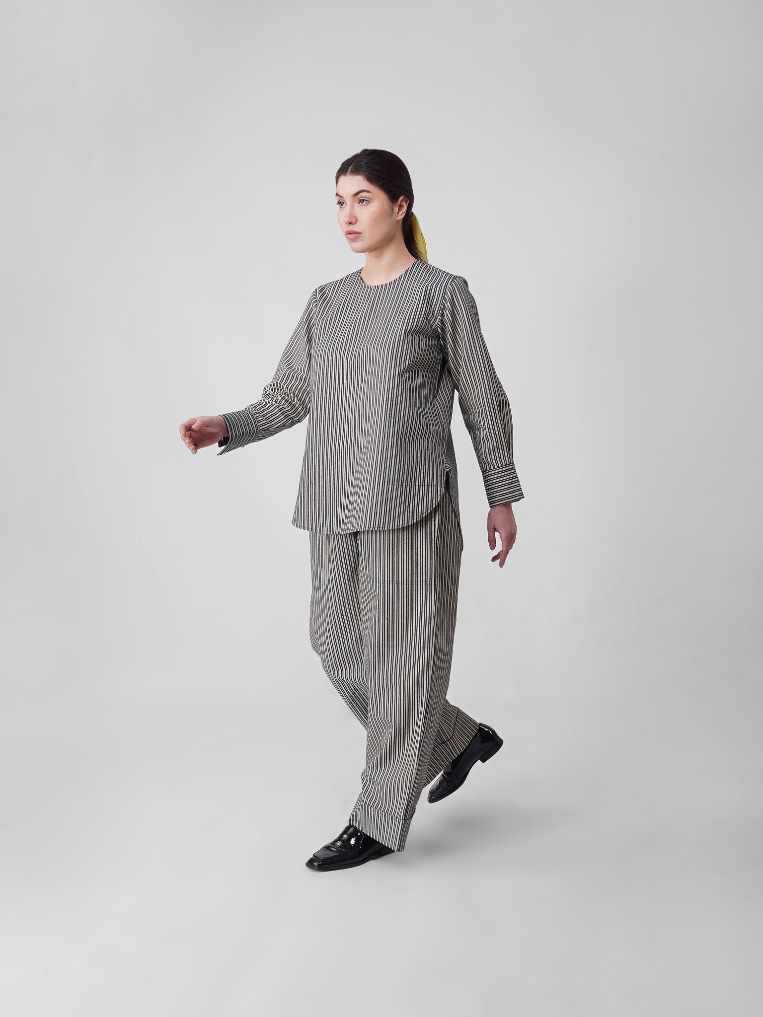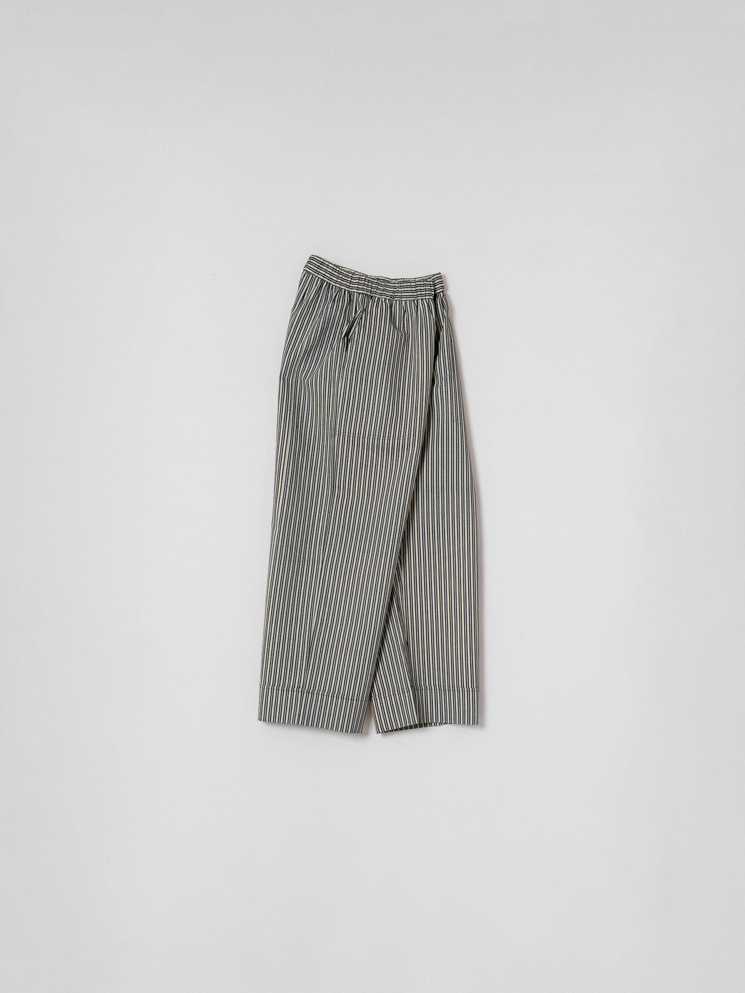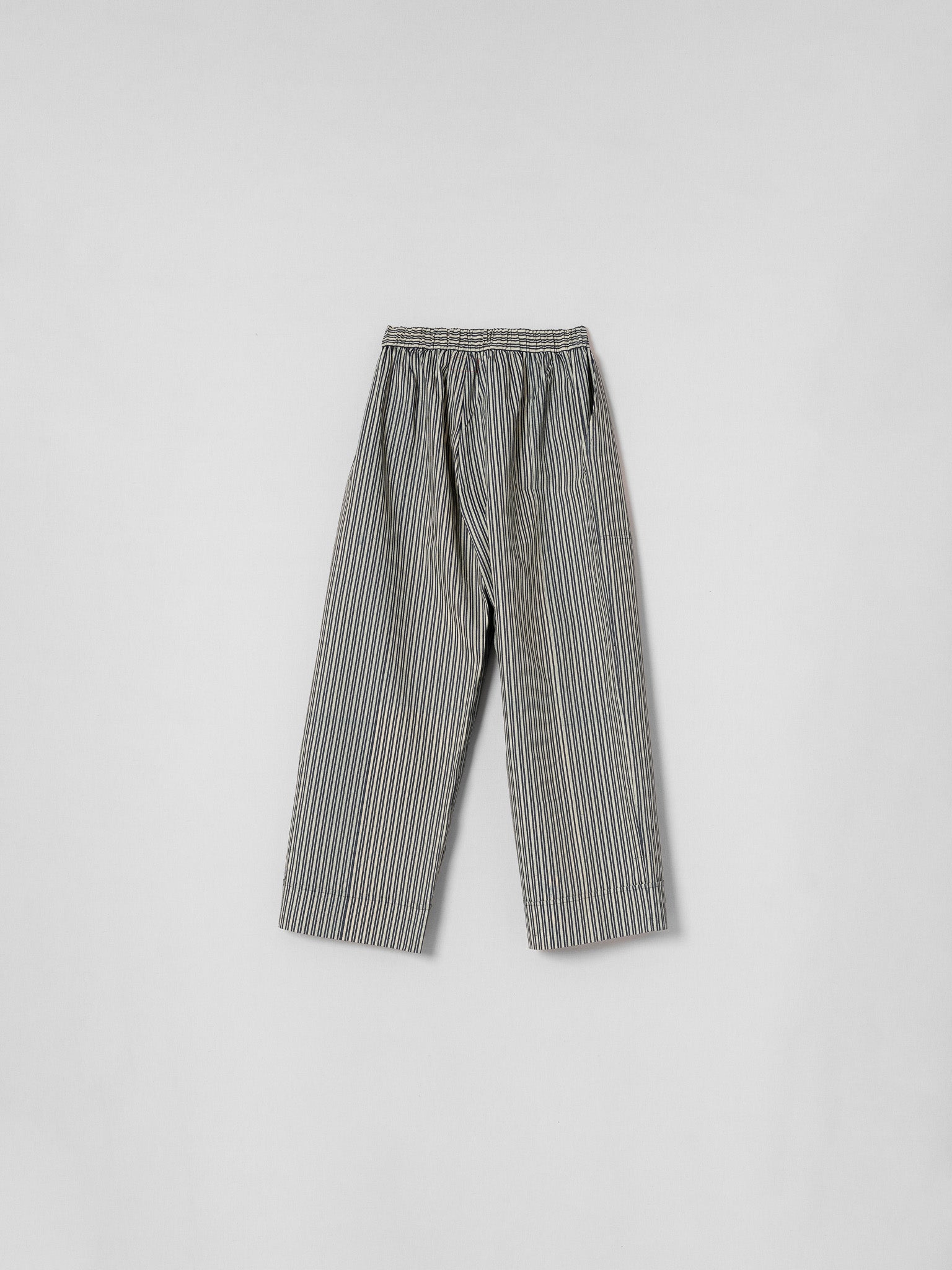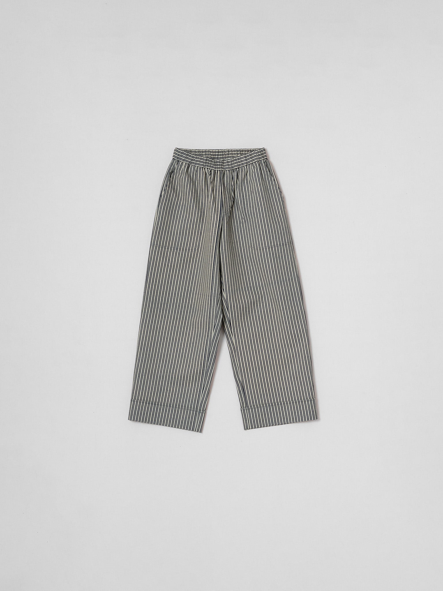 -STRAIGHT PANT HAS A GATHERED ELASTICATED WAIST AND TURN UP HEM.
