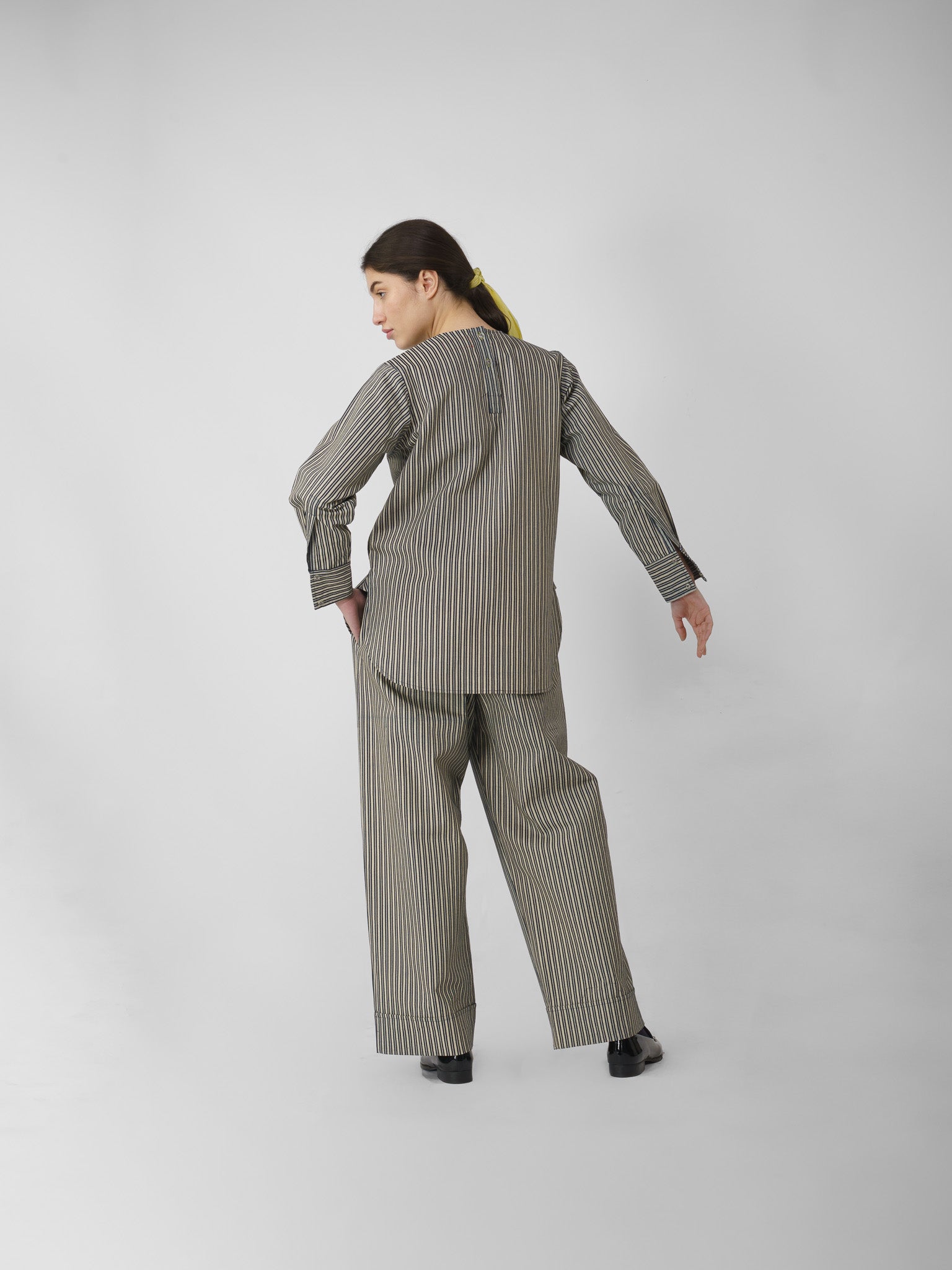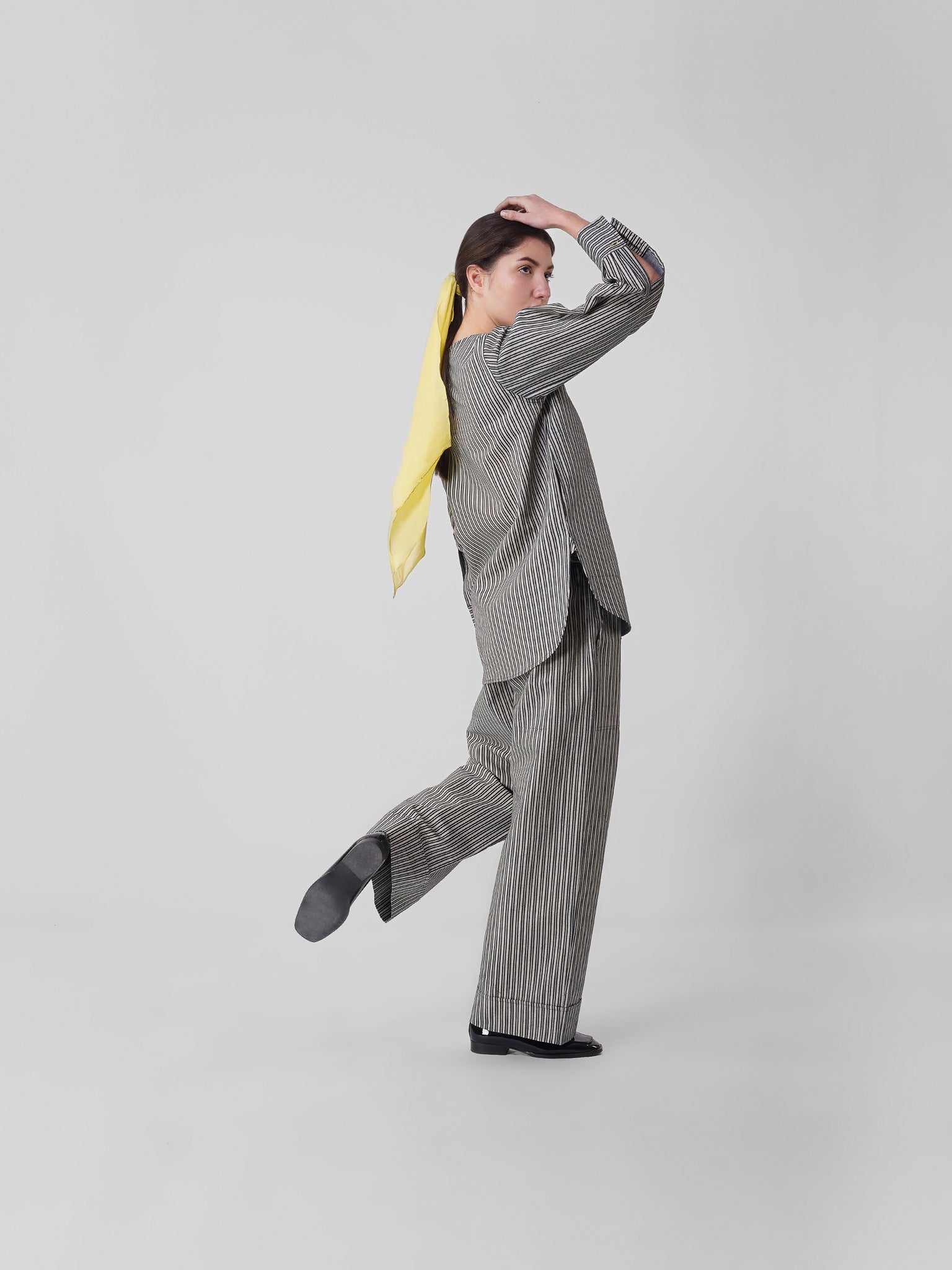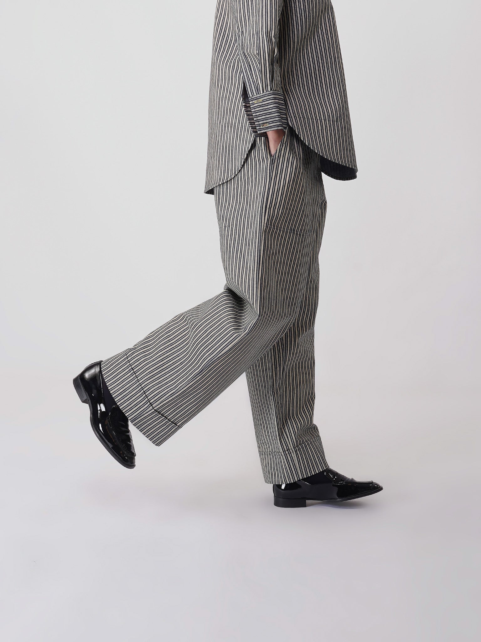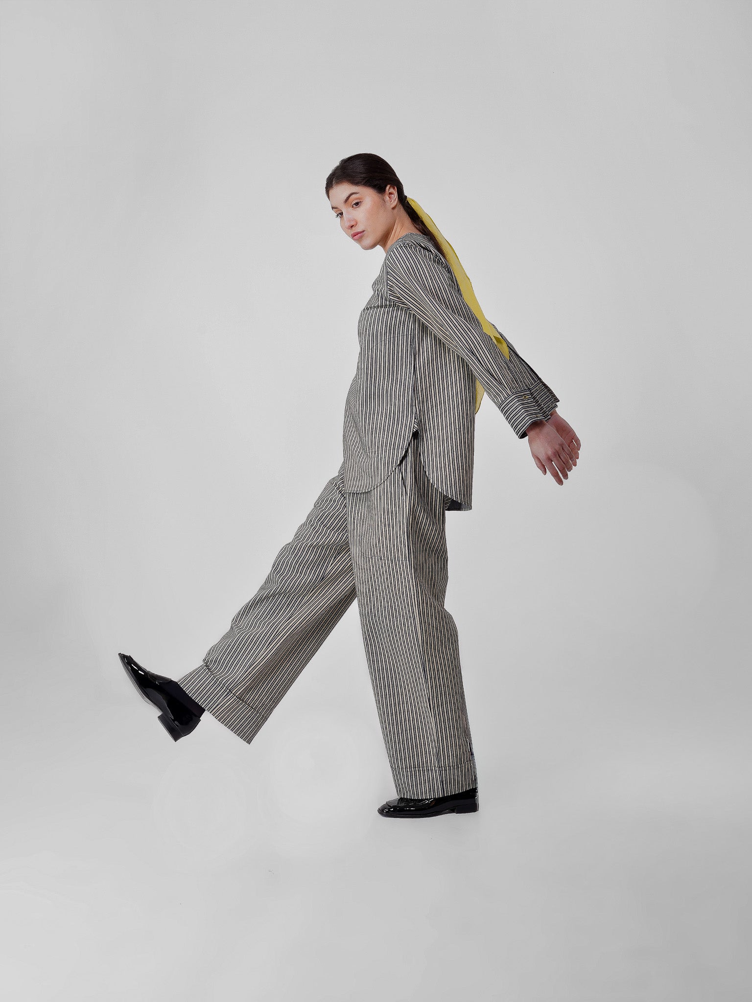-THE PRINT MAKES THE PANT STIFF AND STRUCTURED. IT CAN BE PAIRED WITH STRIPED SHIRT.