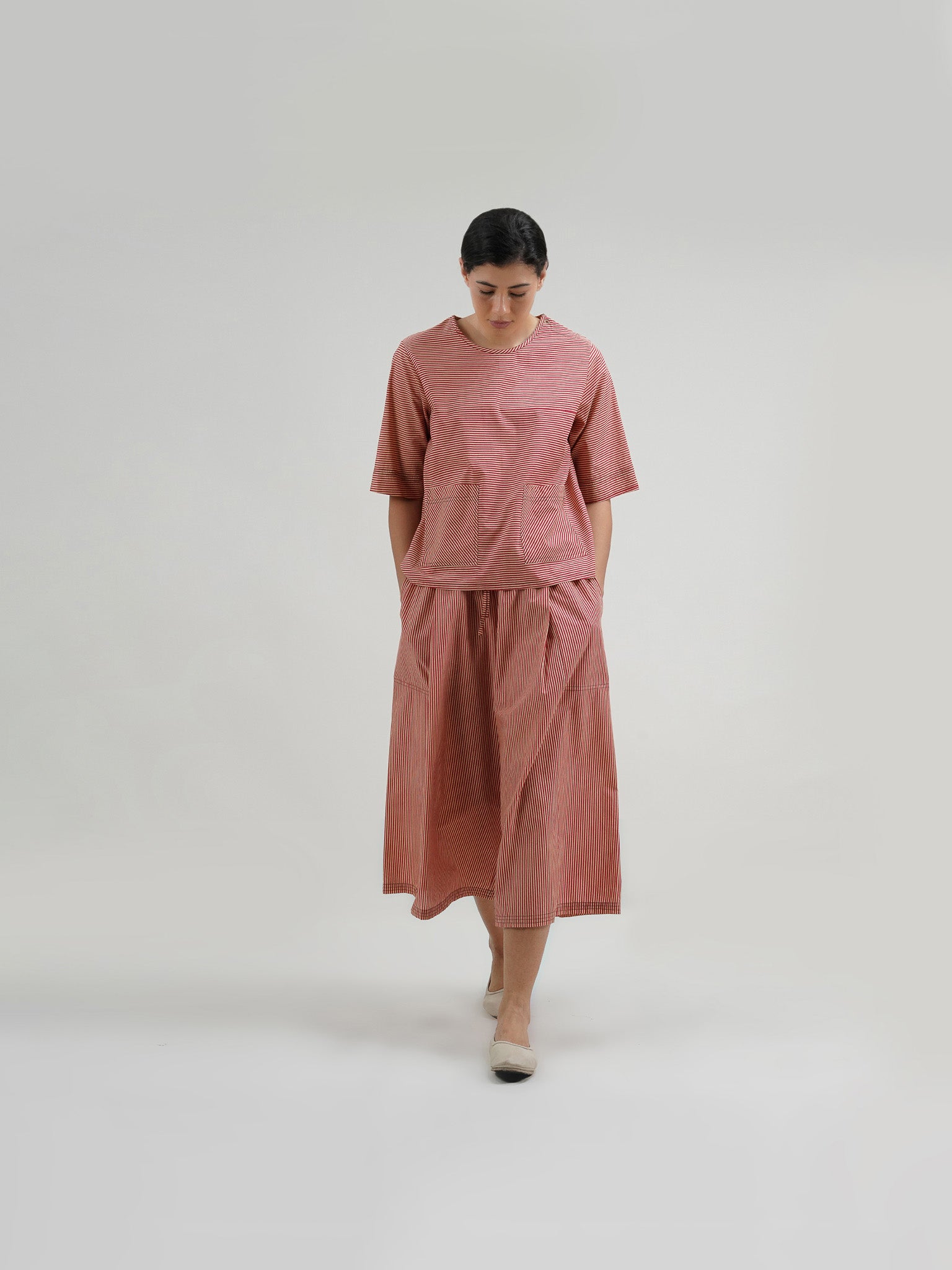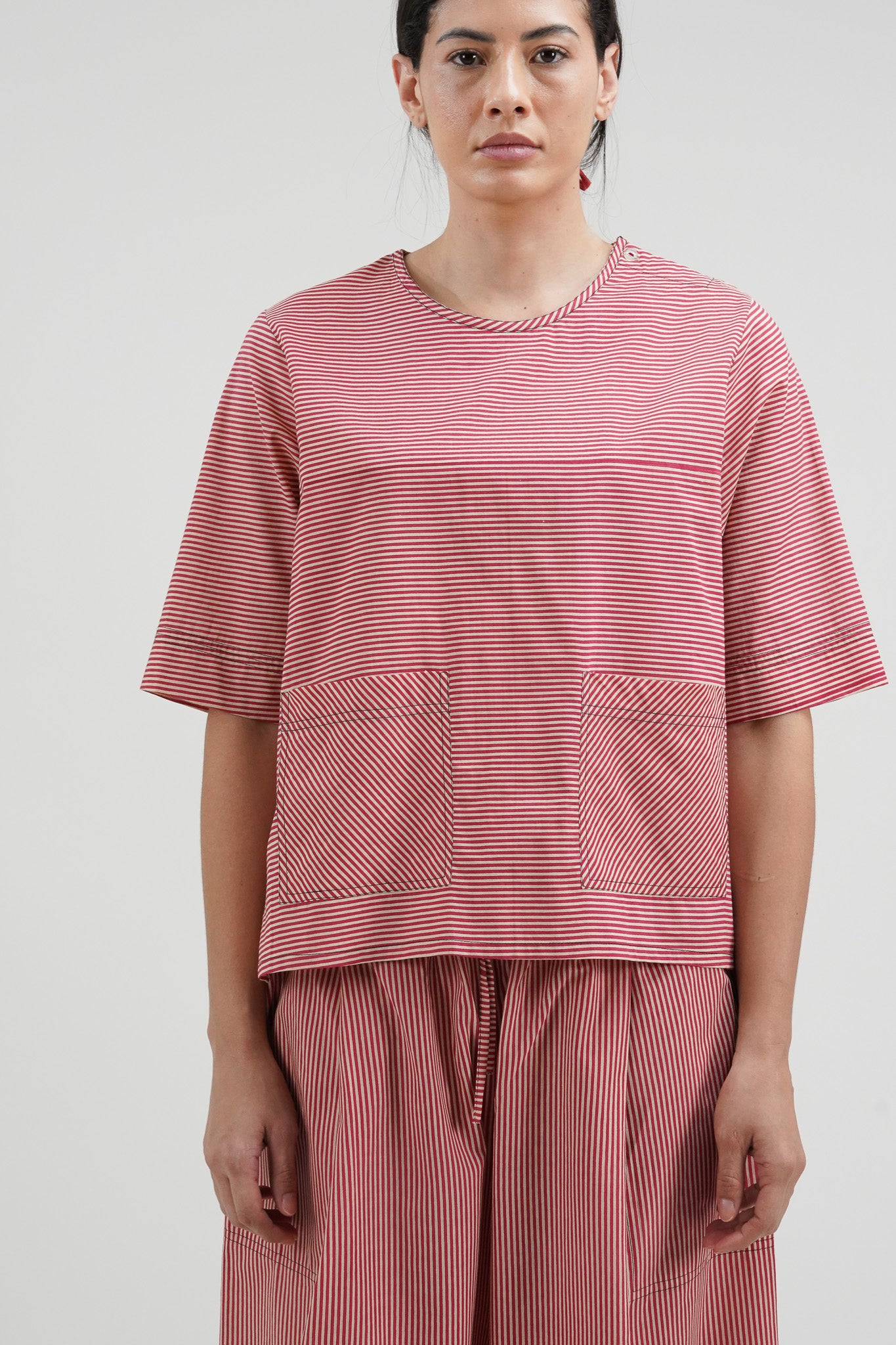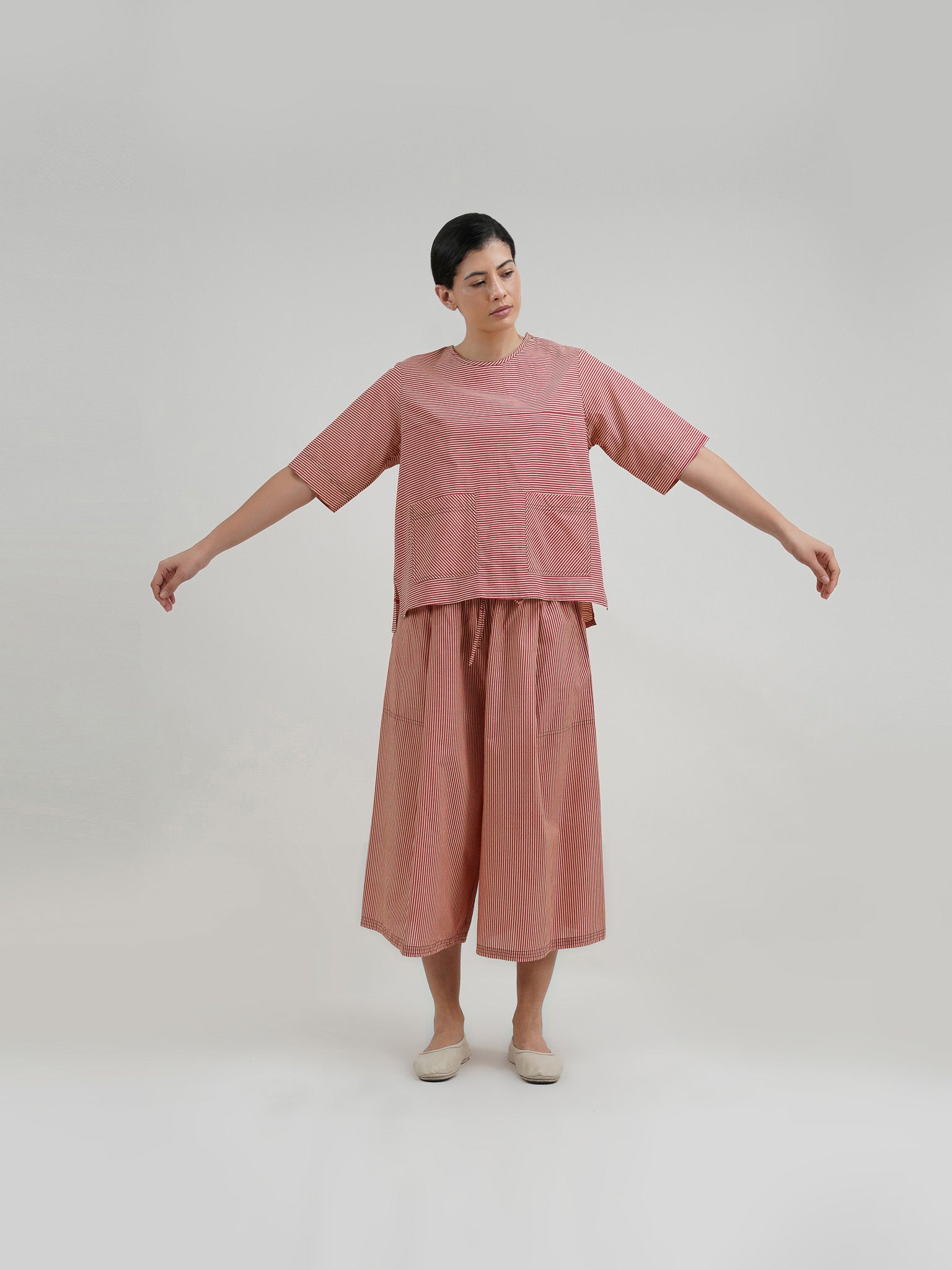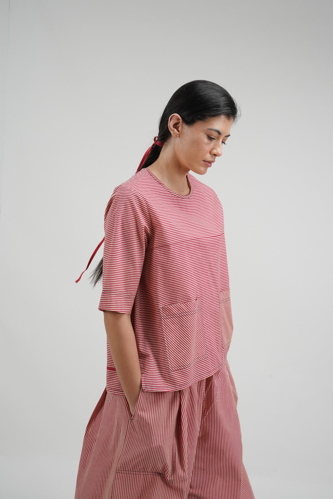 -THIS VERSATILE TOP IS PERFECT FOR ANY SEASON AND CAN BE PAIRED   WITH THE   MATCHING RED-STRIPED PANTS FOR A COMPLETE LOOK.
